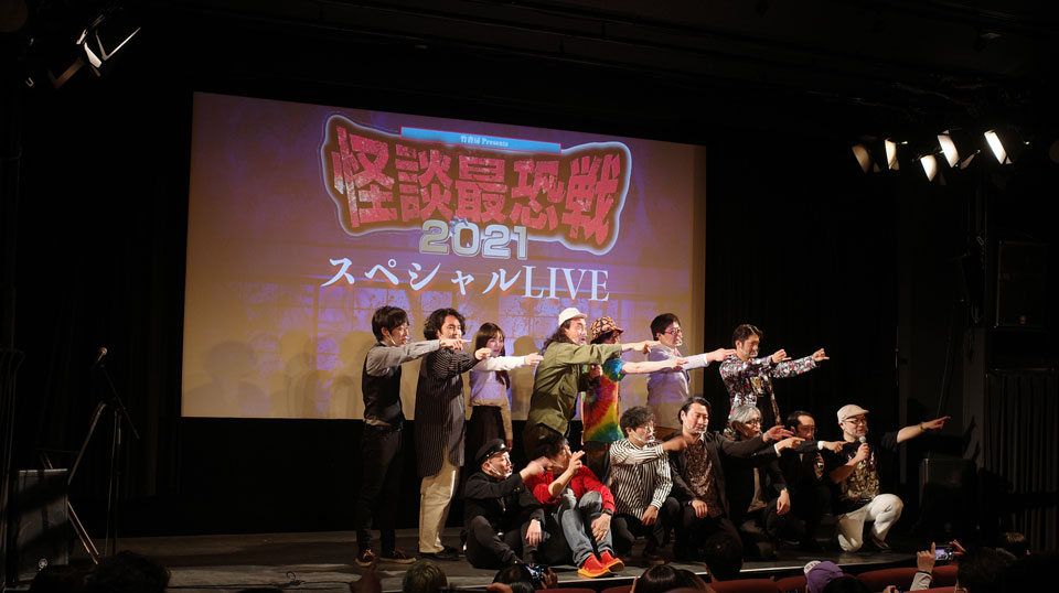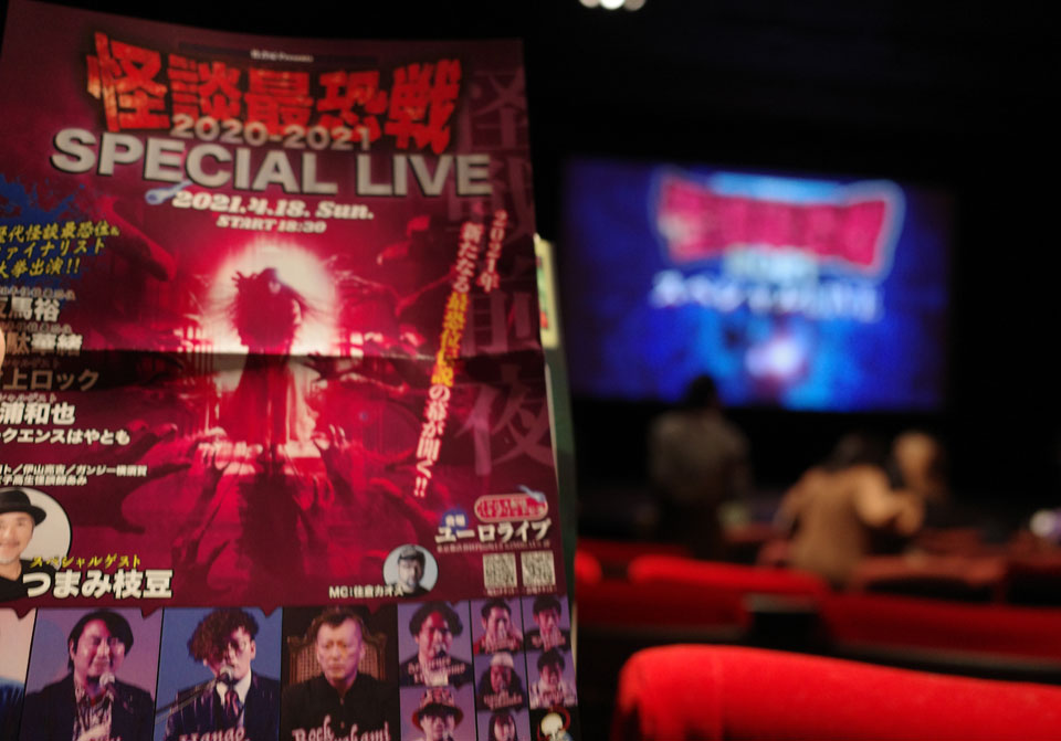 最初のうちは網膜に残る残像が視界いっぱいにもやもやするんですが、なれてくるとバックヤードからの微妙な明かりだけでも前列の人の肌色くらいは見えてくるもんですね。そして怪談語る人のマイク電源の緑のランプがかなりはっきり見えてて。