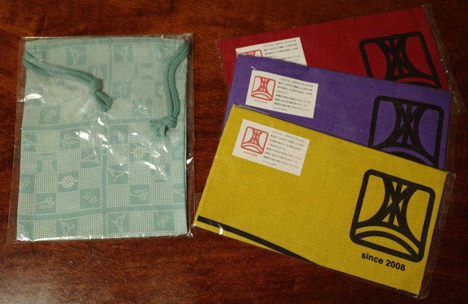 板橋区内にかつての加賀藩屋敷があったということで2008年に友好交流都市になってたのだそうで。画像では畳んだままですが広げてもシンプルながらちょっと洒落たデザインがいかにも金沢がらみ。色もいいですよね。しかも300円と安くていい事ずくめ。左の巾着袋、なにげないようですが、これが絹製なんですよ。