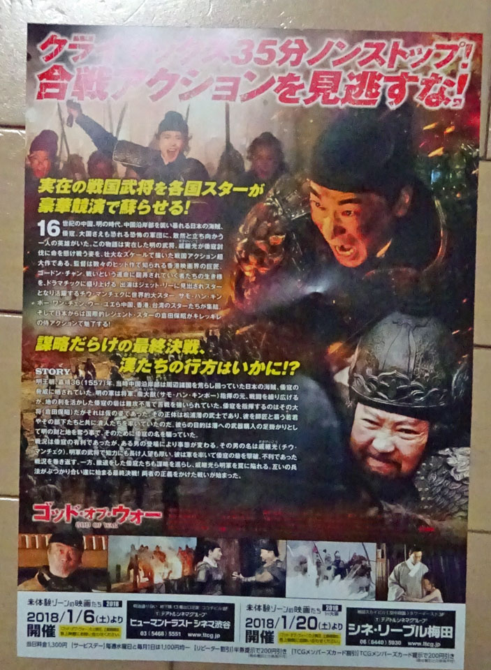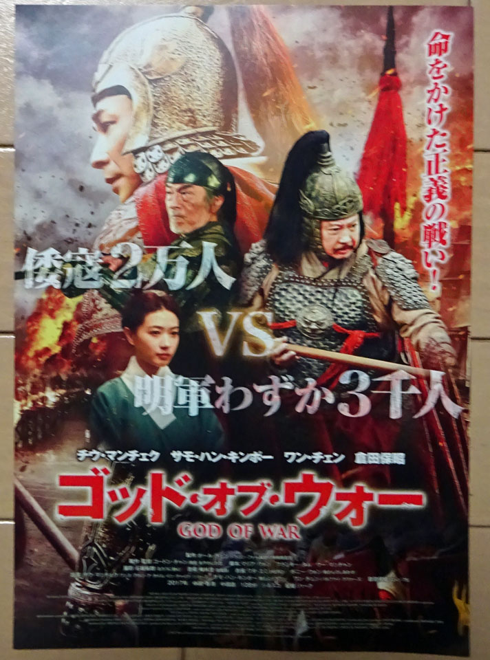 倭寇というのは日本人ばかりでなく中国本土の人間も多くいたというのは史実、それに立ち向かった実在の将軍が主人公。趙文卓チウ・マンシュクは実直な武将が似合いますわ。その奥さんがけっこう強い役回りなのは伝説とかあるんでしょうか、洪金寶サモ・ハン・キンポーも出て見せ場もあるけどチョイ役。それより倭寇の頭目、実は日本のある藩の偉い人倉田保昭が実に戦国時代からの侍らしい強かさと尋常でない強さを見せてくれます。その藩の若殿が小出恵介で映画で見られるのはこれで最後かなあ。乱暴狼藉ばかりかと思った倭寇の中の浪人群の首領が意外な顔見せたり、けっこうどの人にも思わぬ面の見せ場作るとか上手い。派手ではないけど結構いい映画。