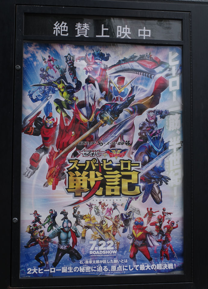 恒例仮面ライダーとスーパー戦隊合体共闘映画。公開週は連休ということと関係なくいつもの大泉学園のスタジオ以外の場所で仕事で、これは大泉でみなきゃだめでしょうと週明けてから見てきました。毎度設定を色々凝らしてくるけどとにかくお祭りですよねえ。今季ライダーはもともと物語の世界を扱い、戦隊は過去戦隊の能力を扱うということで混じったり広げたりしやすい……と、のほほんと見始めたらいきなり西遊記と八犬伝を並走させるという暴挙に出て、やりたい放題やなあこれぞお祭り。太秦映画村の場面では奥に佐武と市がいるし。が本題は後半でした。メタだメタだという評判は目にしていたもののこう来るとは。そこまで1号ライダーの声の出演だけかと思ってた藤岡弘、が本郷猛として出てからのセリフは泣けましたよ。「物語は実在し、現実も変える」てのもすごいセリフだなあ。併映の次期ライダーの短編は面白くはあったけど、今回は特になくても良かったかも。