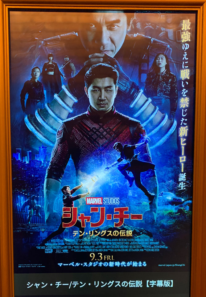 マーベルの新ヒーロー、アジア系。とあるけどまるきり香港中国映画ではないですかという評判を目にしてホントかなあ贔屓目ではと見てみたら予想以上にほんとに香港映画で。予告編にあるサンフランシスコやマカオでのアクションがまあまさにそれですが、後半あんな映画になるなんてともいわれてた中華なワカンダ、桃源郷みたいなとこがこれも予想では付け足しくらいかと思えば普通の世界のほうがむしろ前座、こっちが本編ではないですか。ワクチン打ってから見に行くことにしてたので上映すぐに見れなくてスクリーンはやや小さめになっちゃったけど公開直後だとこの場面のことも感想書きにくかったろなあ。