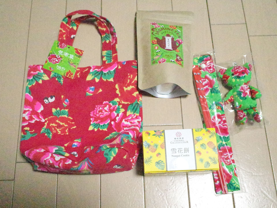ひとつは台湾たしか買い物バッグセット、あの白赤青三色のランドリーバッグに似せた、でも程よく小さいサイズにお茶など詰めたもの。もう一つが