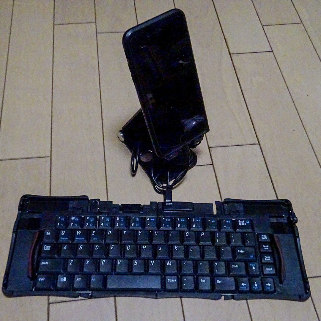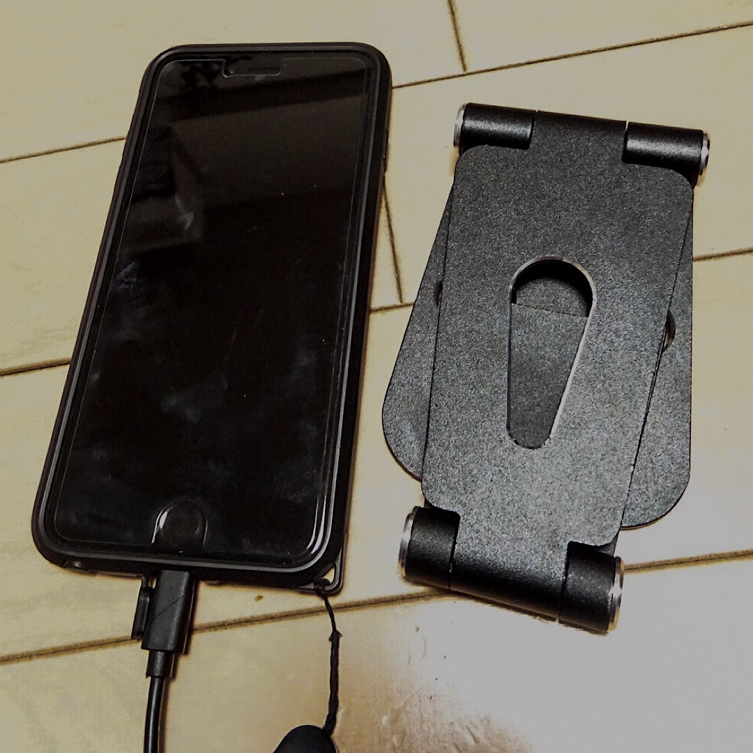 せっかく打ちやすい折りたたみキーボード買ったのに、iPhoneが横倒しではどうも作業しづらいので、縦でしかも下部のコネクタ部がじゃまにならないスタンドを買いました。
