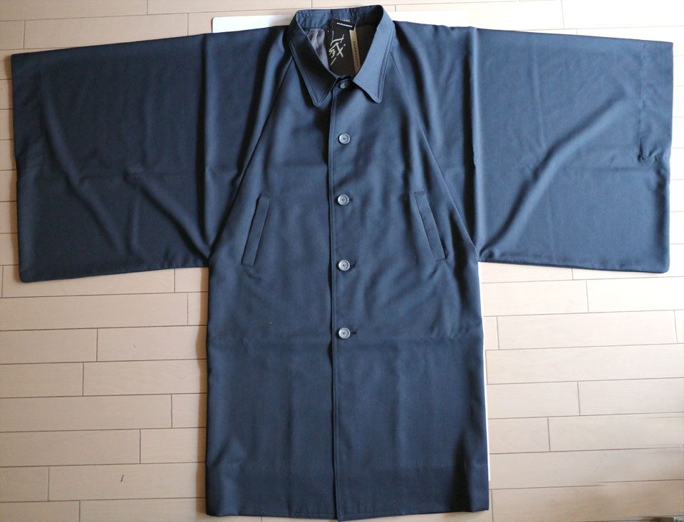 袖が和服なものの、生地は洋服のレインコート用で撥水加工。薄くて軽いので、梅雨寒のときなどでもいいはずです、と。ネット通販だとこの手の色はあまり選ばないのですが、実物見て羽織ってみるとしっくり来たのですぐさまお願いしました。春先秋口のコートとしても重宝しそう。