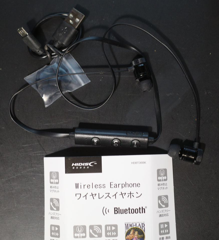 今度はちゃんと両耳用のブルートゥースイヤホン。耳に当てる反対側に磁石仕込まれてて、絡み防止になってるようです。一見両耳用でも実はモノラルとかいうのではあるまいな、と試したらちゃんとステレオでした。更にマイクもついてて、ちゃんと使える。さすがに100円でも300円でもなく550円。でも安いよねえ。