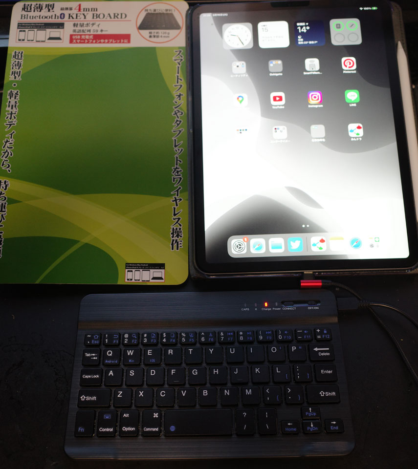 最近ちょっと仕事場でパソコンが使えなくてiPadで文字入力することがあるかも、さてどうするかなあキーボード買うかあとよく見たら買ったままのものが開封もせずにあったので、試してみたら結構使えるじゃあないですか。長時間なるとどうかわからないけど、前に秋葉原で800円とかで買ったものだからなあ。何よりコンパクト。ここまで来ると折りたたみより式よりも使いやすいのではと。