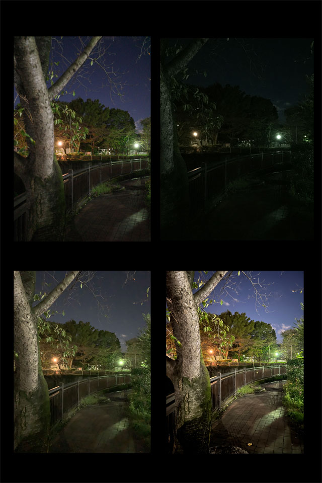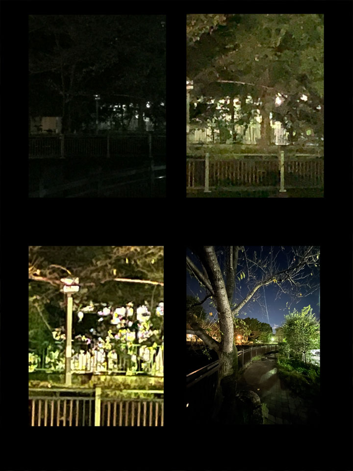 左下がiPhone13。どれも暗いとこなので流石に遠くはグダグダな絵になりますが、望遠の倍率自体の差はよく出てるのではと。ついでに、iPhone11か12あたりから搭載された超広角画面が右下。これはなかなかすごいですよねえ。これで動画も撮れちゃうんだから、何を撮ろうかなあ。