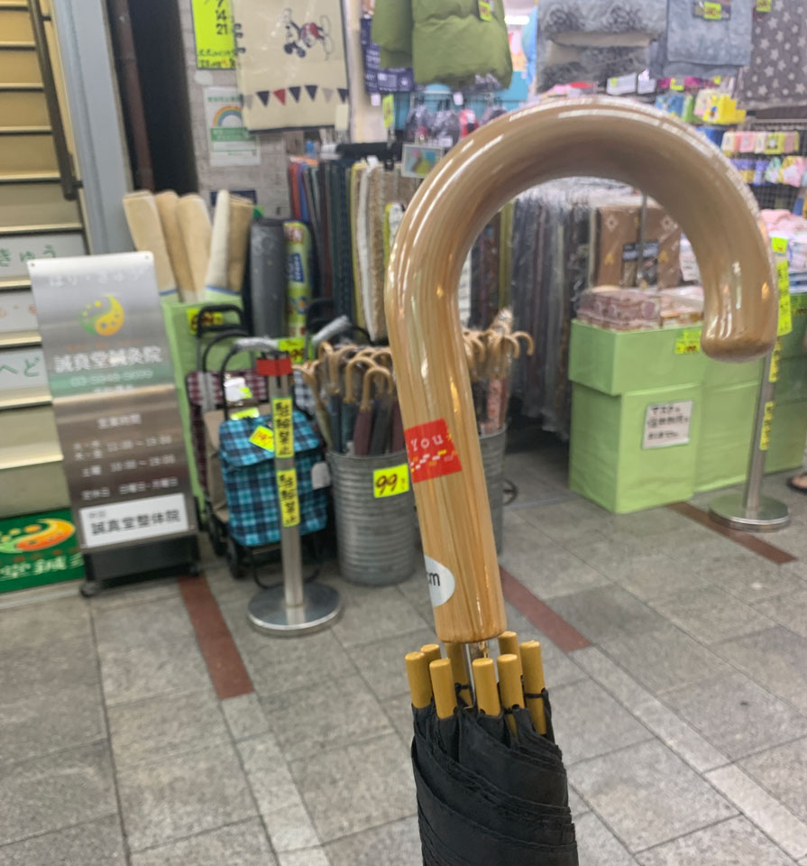 日曜だったか、散歩にでかけた時点では天気予報は曇り。ところが怪しくなり始めポツポツがドドドドと。ひどい降りになる前になんとか十条商店街のアーケードに逃げ込み、しばらく待つもどうも埒が明かないので傘買うか、と。百均でもいいしと歩き始めたら洋品店で600円くらいで割合ちゃんとしたのがあるではないですが。これで十分だなあとさらに足をすすめると