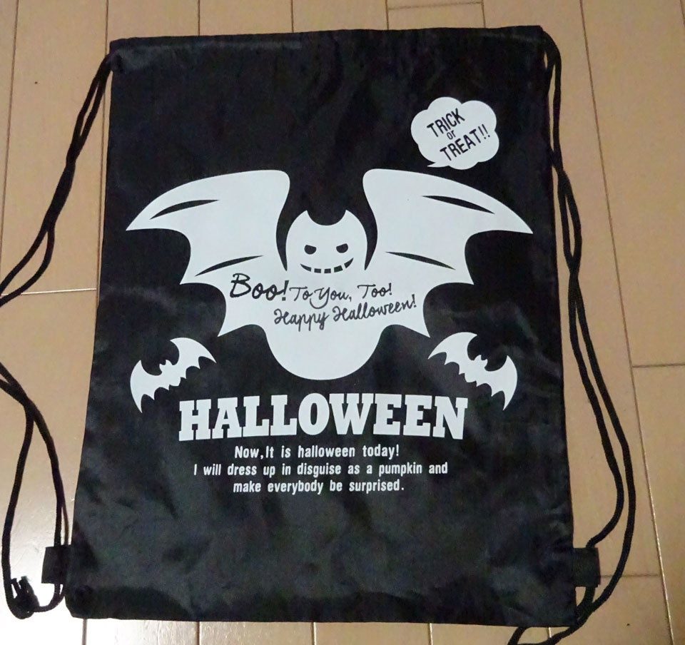 蝙蝠具 その483 エコバッグ ハロウィン物なんですが、便利なんでいつも畳んで鞄に入れてます。何が優れてると言って紐を見るとわかるようにリュックになってるとこ。ハロウィン以外の時期は裏面にすれば黒一色だけになるし。