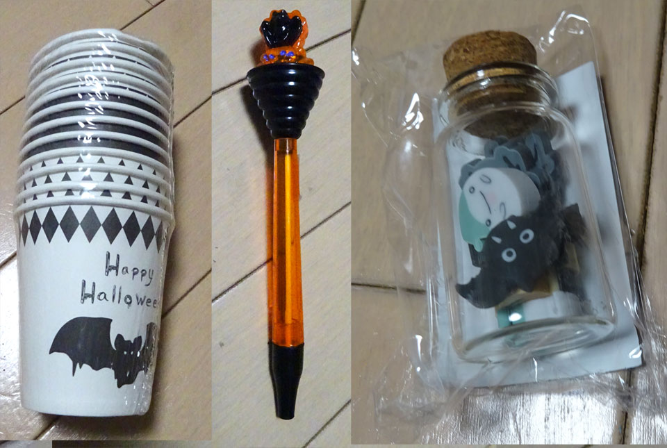 同じくハロウィン時期の紙コップ、ボールペン、何か瓶に詰め合わせ。