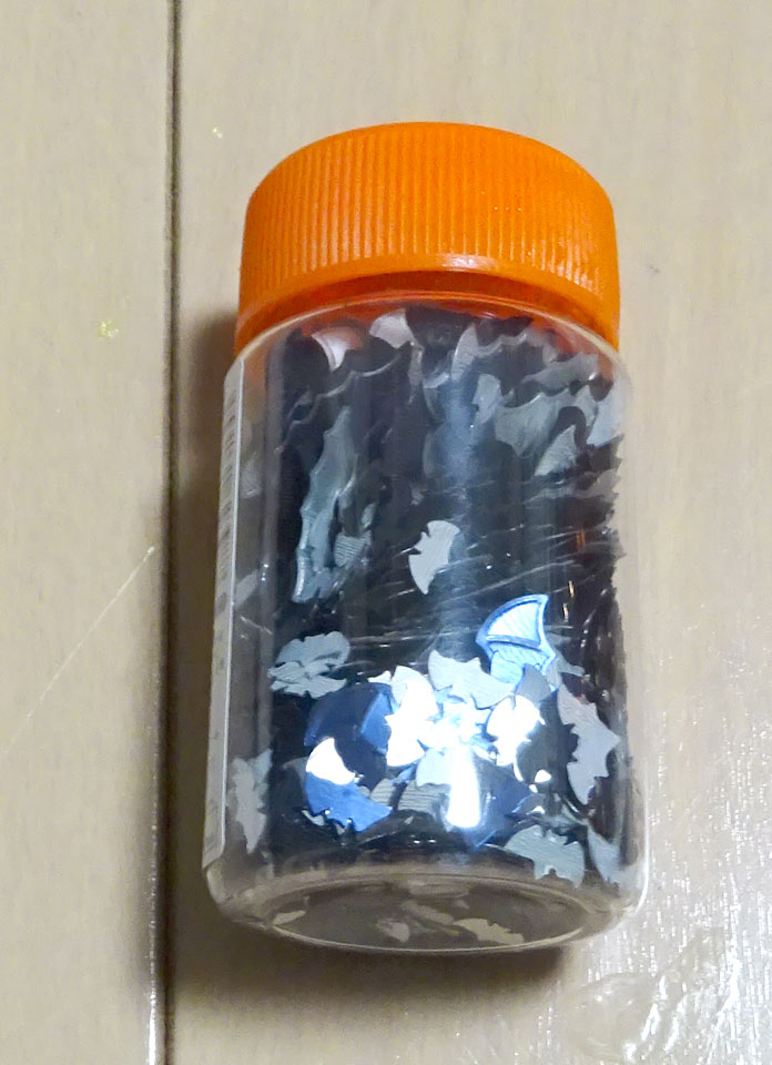 いよいよハロウィン近づいてきて百均あたりでも蝙蝠系のものたくさん出てますね。いろんな飾り物ある中で、この瓶入りはお得。白黒銀と三色混じって使い放題です。何につけようかな。