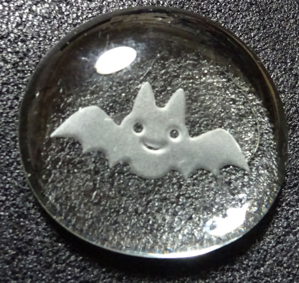 蝙蝠具 その480 おはじき 同じものに部品つけてペンダントトップにしてるものも売ってたたのですが、ここはあえてガラスのおはじきそのままで。ガラスのコウモリグッズは大変珍しいのです。秋のデザフェスでのコウモリ物はここまででしたが、それ以外のコウモリ物はまた後日ご紹介予定。