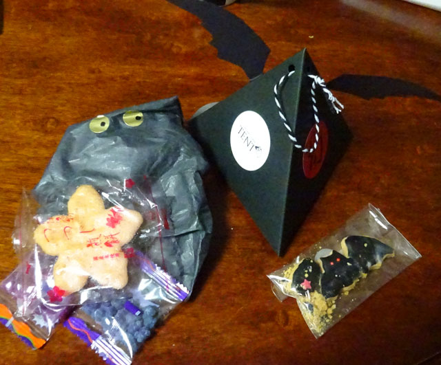 蝙蝠具その457 蝙蝠羽つき三角紙パック+お菓子 根津のカフェギャラリー幻とその近くにこの夏オープンしたばかりというカフェギャラリーtentでコラボ『卑怯なコウモリ』展というので最終日10月29日に覗いてきまして、趣旨としては幻のほうがケモノの国、tentoが鳥の国そのあいだを蝙蝠みたいに行き来してくださいということで展示品自体に蝙蝠物はあまりなかった(無くもなかったですが)うち、片方の店でこのパック入りのお菓子買うともう一方に行って追加でお菓子入れてもらえるというもの。 三角紙パックは市販のものに翼とシールつけただけですがたたむとペタンとなるもの。うまい構造だなあ。