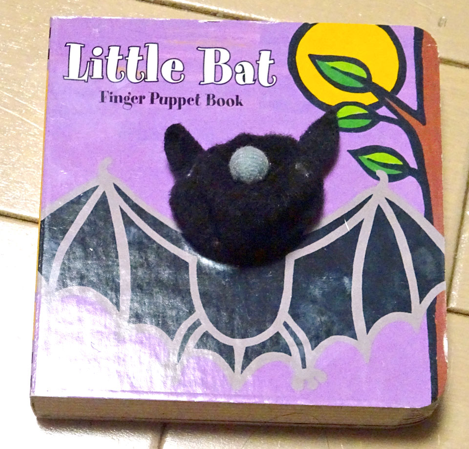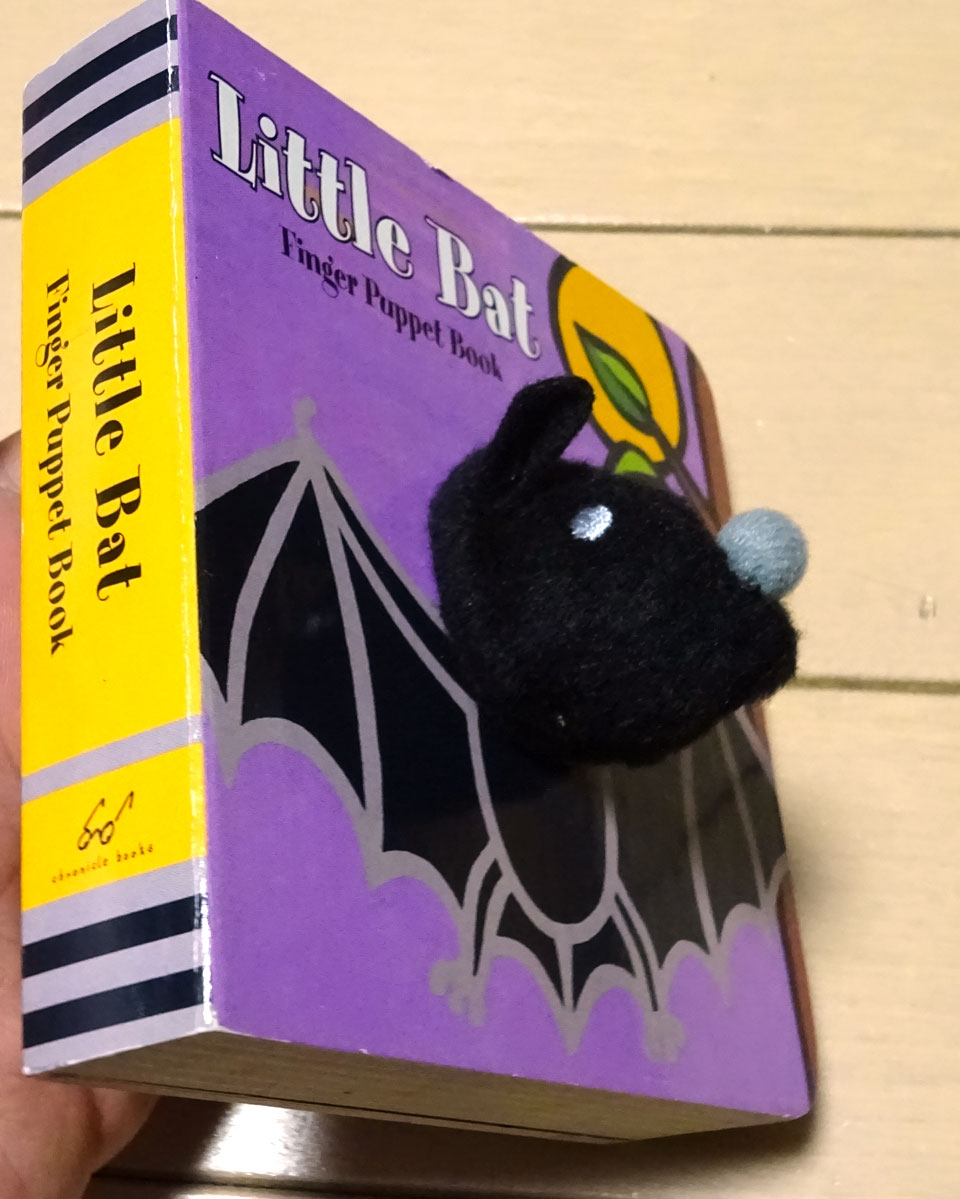 蝙蝠具その459 パペット絵本 外国製のもので、表から見ると何やらコウモリが膨らんでるだけですが、実は絵本中心を貫いて穴があり、裏から指を差し込んでパペットとして操れるというなんとも素晴らしいもの。 手間かかる作りだけどいいですよねえ。日本でも出てほしいなこう言うの。