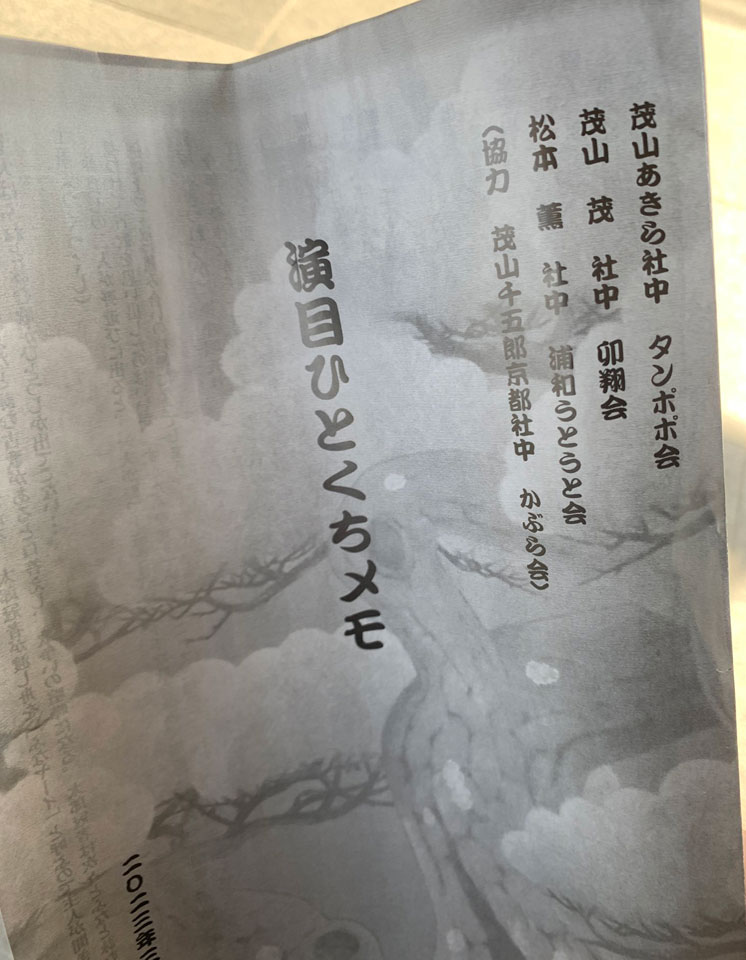 以前から茂山あきら社中タンポポ会という狂言の教室の公演が年一回あって、声優の茶風林さん、水落幸子さん、肱岡拓郎さんらが出演されてるのを見に行ってたのですがちょっとお休みしてたのかな、久しぶりの公演は茂山あきら社中・タンポポ会、茂山茂社中・卯翔会、松本薫社中・浦和うとうと会、と三団体合同の狂言の会となりました。