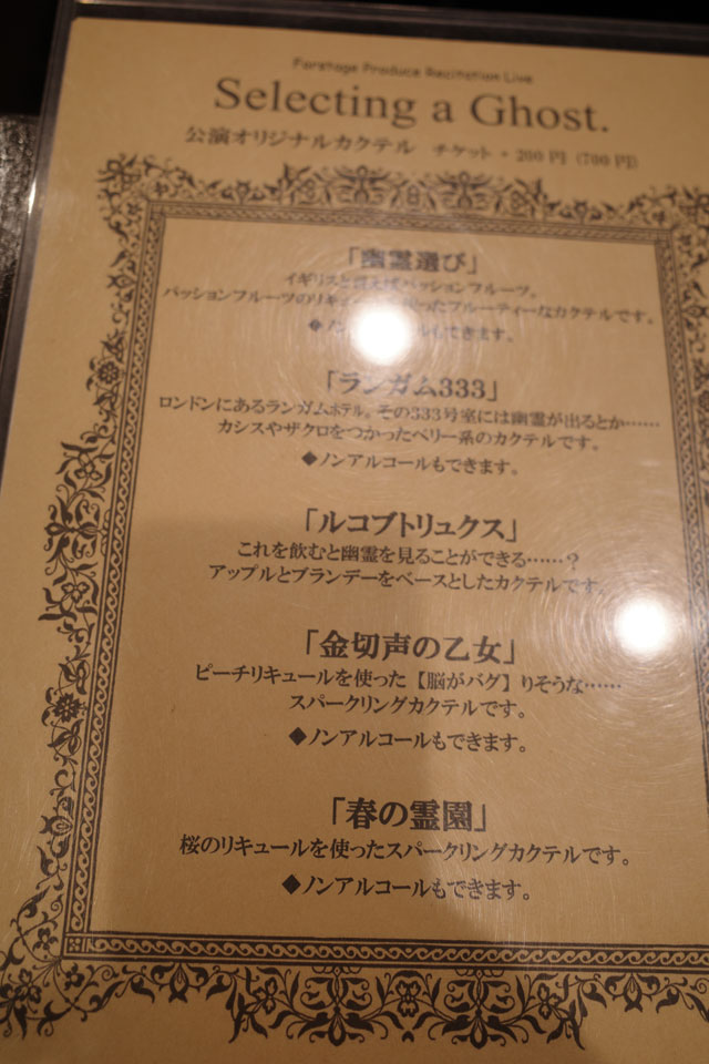 バーのドリンクメニューも内容に合わせたオリジナルカクテルが出てきました。