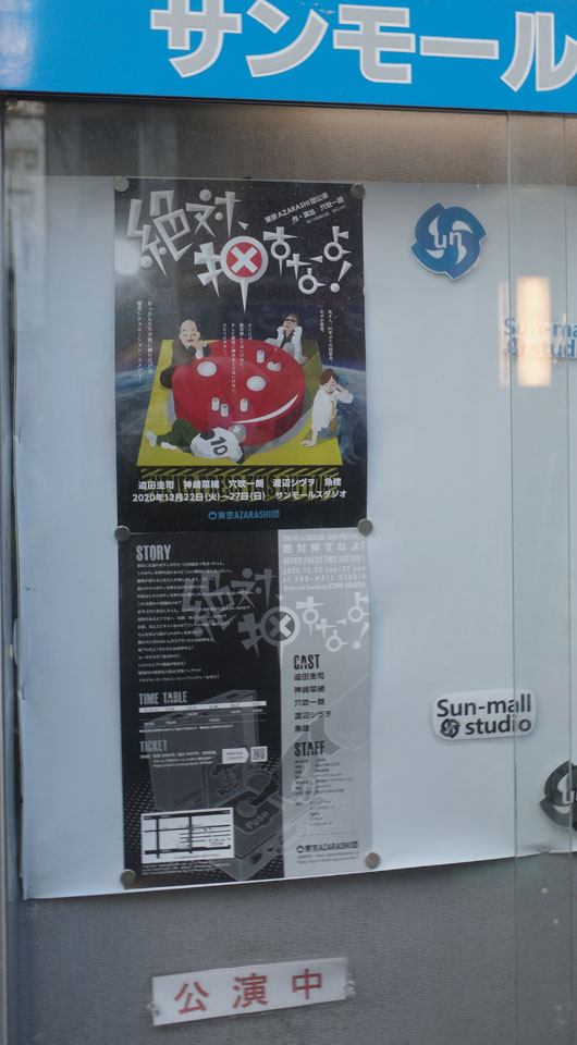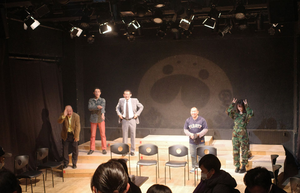 小学校の同窓会、で集まったはずの4人の中年男と謎の若い女性、舞台にあるのは謎のボタン。というところからのコメディであり✕✕であり。最後はああこの劇団だなあという落とし所。まあとにかく達者な人たちがどこからかわからないアドリブもかましながらの小気味いいテンポのやり取りが楽しい。若い女性は初舞台とのこと。これから人気出そうな人だったなあ。舞台公演はいろいろ厳しいご時世ですが次回も楽しみですね。