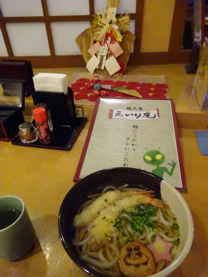 とりあえず、えいり庵という店でうどんを。肉うどん、天ぷらうどん、きつねうどんに唐揚げとかしわ飯、ぜんざいなどだけに絞ったメニューのうどん屋さん。そこは北九州なんで、うどんの味はちゃんといいです。麺もふにゃふにゃ。ちなみにラーメン屋さんは流星拳、じゃなくて流星軒。