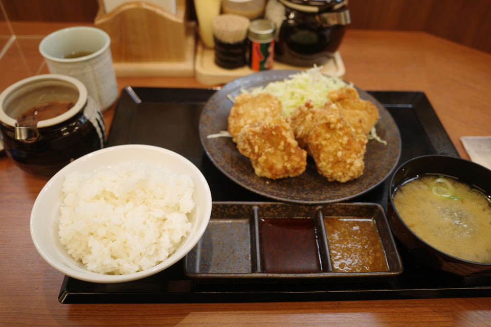 入ってみるとまさに。大ぶりの唐揚げは4,5,6個から選べてご飯大盛りも出来ますよ。2種類のタレもつけるとまた味が変わる唐揚げ本体が、何もつけなくてもすごく美味しいのだけれど、定食につくイカの塩辛がすごく美味しいんですよ。しかも壺で来るのでついご飯大盛りにしたくなってしまう、いかんいかん。