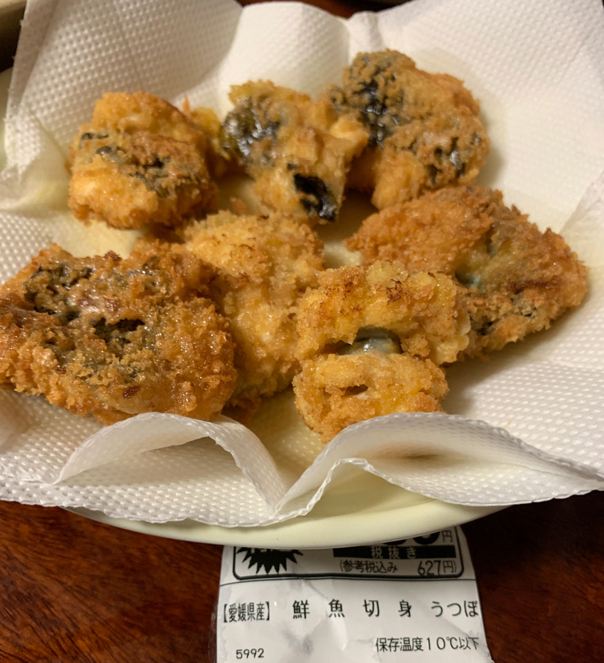 切り身の段階でかなり細かく包丁目が入れてあり、鱧のように小骨が多くて切れ目入れないと食べにくいらしい。味は白身魚の淡白さに、皮の辺りに濃厚な味わいが。フライだからとソースで食べ始めたんですが、ポン酢にしたらより美味しくいただけました。コロナ以降普段見ない魚が売り場に出る率高くなってる気がするのでまたいいときあったら試してみたい。