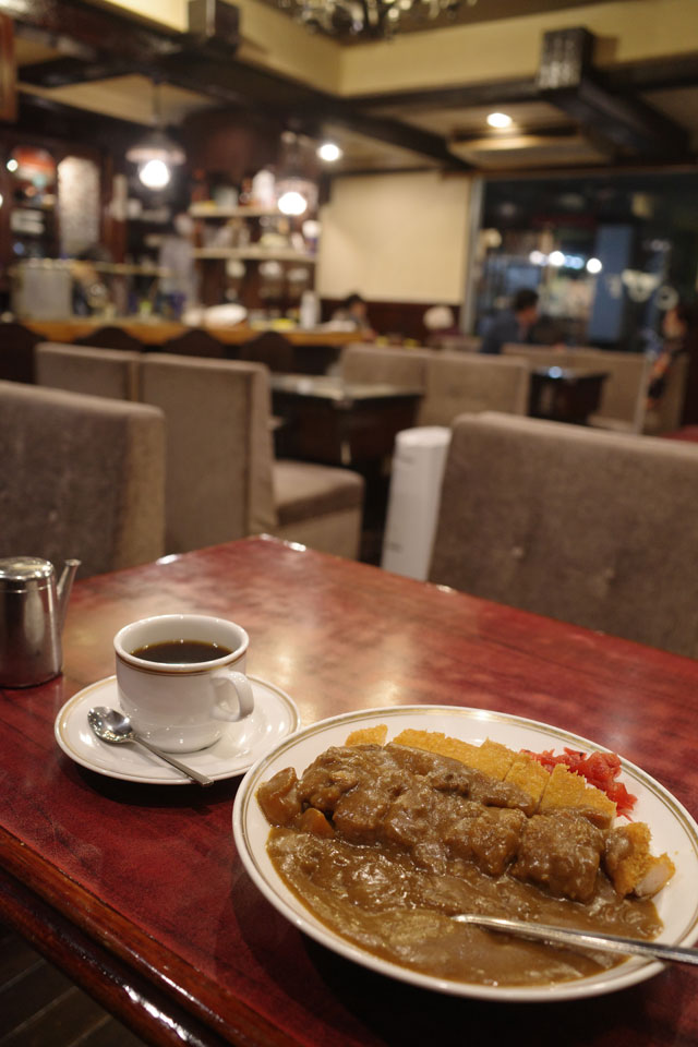 たまたまネット動画で見た店がイベント会場の近く。いかにも老舗な作りの喫茶店で、食事類のメニューが豊富すぎるくらい。こういう店に似合いのナポリタンもいいなあ、評判のエビサンドもいいなあとおもいながらしっかり食べるというコンセプトのもと、カツカレーとしました。
