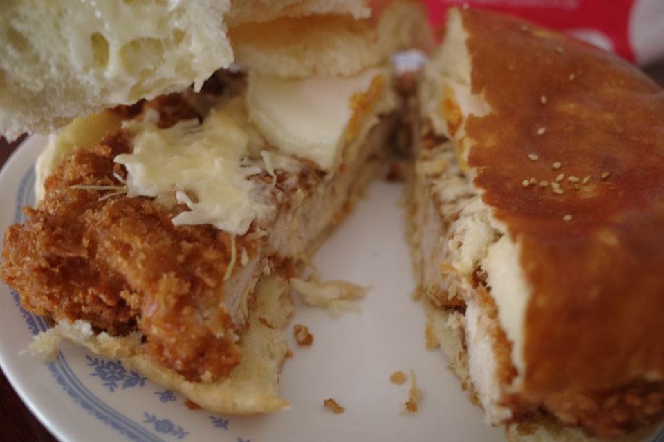 中にはそのパンの大きさいっぱいのチキンカツと、キャベツに卵、マヨネーズ。