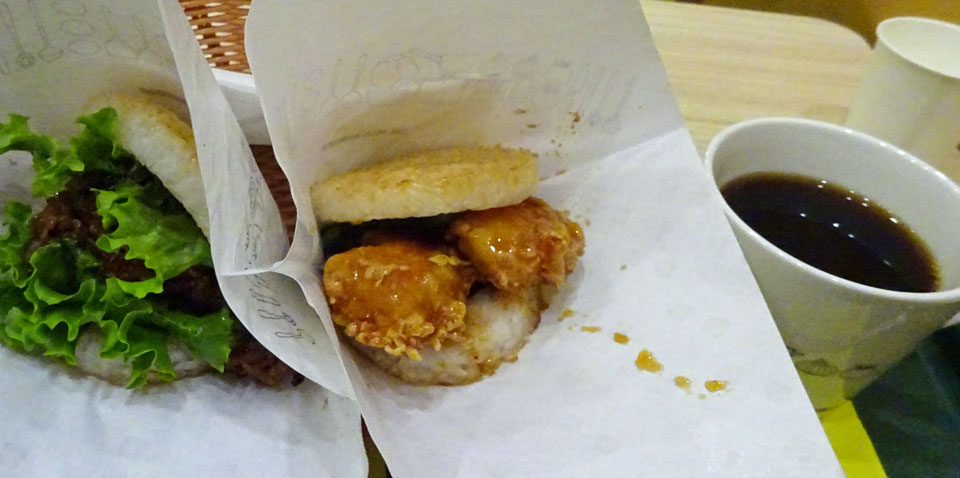 期間限定メニューのライスバーガー、海老の天ぷら。なにやらSFで書かれてたとかで一部で話題になってたようです。期間始まってすぐに試してみてました。