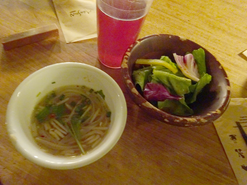 ランチ数種類はドリンク、サラダバー付き。それは珍しくないけど、ここはフォーがつき、それも香川のうどんみたいに自分で好きな量を茹でるというもの。女性が来やすいようにランチ自体のボリュームは抑えめなのでもっと食べたい人はこれで加減するといいということなんでしょうか。このフォーとスープ自体が結構美味しくてすこしお代りしたくらい。