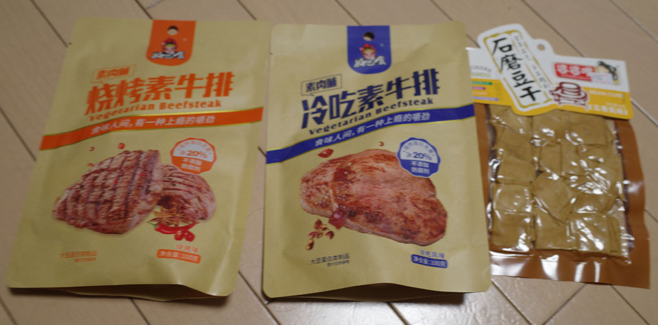 大豆製の肉、ベジタリアンビーフステーキとあるもの。左がちょい辛、真ん中が普通味。