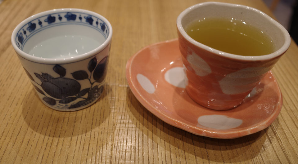 セルフサービスの水はきりっと冷たいレモン水。そば猪口でいただけます。お茶の器がとても可愛い上に、すごく美味しい。
