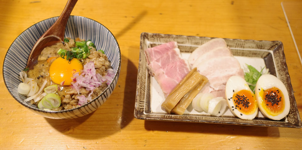 煮干出汁炊き込みご飯。もちろん麺類のサイドメニューなんだけど、たいてい麺だけで腹いっぱいなるのでなかなか頼めませんでした。試しに、麺無しでご飯だけ頼んでもいいですかと聞いてみるともちろんいいですよ、と。ご飯だけもあるけど卵かけバージョンもあるので迷わずそちらに。それだけでは何なので、おつまみ三種セットもつけました。見て分かる通りどれも極うま。腹ぐらいによってはこれで丁度いい量かと。