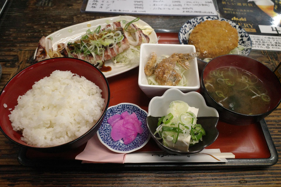 たしかによく見たらイカの丸焼き、メンチカツ、鰯の竜田揚げ、全部入りの定食でした。
