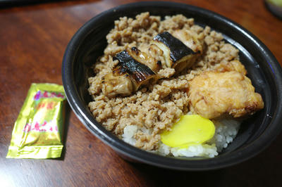 そぼろ弁当とは名ばかり、焼き鳥ねぎまの串を抜いたものと、唐揚げまではいっており、すごいボリューム。もちろん味は素晴らしいの一言。鶏うま煮丼も美味しそうだなあ。ハイカロリー弁当と名付けられてるチキンカツ弁当はどれくらいのボリュームなんだろう。