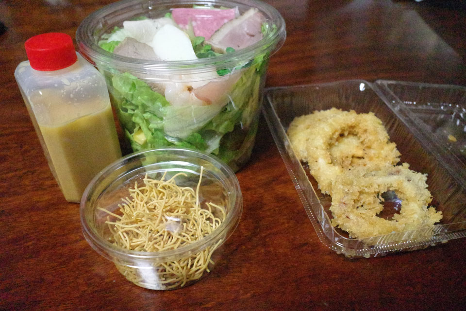 容器に入ってるからわかりにくいけど結構たっぷり。しかもエビ、ゆで卵にハム類数種類で盛りだくさん。パリパリ麺のトッピングがとても合い、しかもこのドレッシングがメチャ旨!たっぷりあったので半分ですんで、翌日別のサラダに使いました。少しお値段した以上のことがあったなあ。ついでに買ったイカリングがまたすごく美味しい。サクサクしてイカは柔らかい。まだ暖かかったのが、冷えても美味しかったです。
