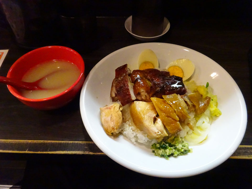 地下鉄東西線早稲田駅すぐ。店内狭いので焼鳥、焼鴨、ローストポーク、チャーシューなどをご飯に乗せるかビーフンに乗せるかとメニューは絞ってあります。このときはチャーシューが切れてたので、焼鴨と油鶏肉のご飯のせ。