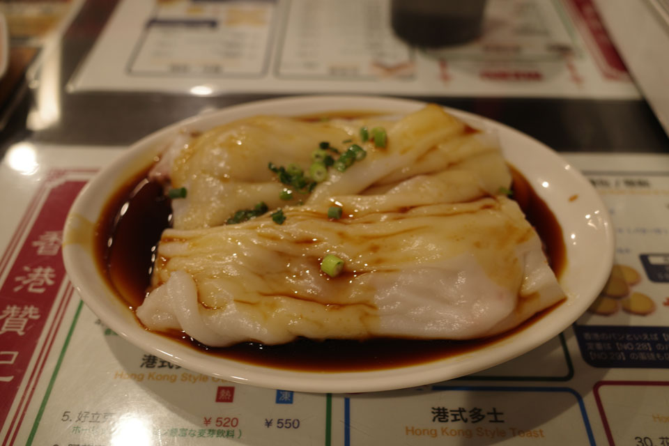 お店の人に、腸粉あります?と尋ねるとメニュー見せてくれて、5種類あるうち日本で人気なのは一番上のエビ。でも香港では一番下のチャーシュー、と聞いて、迷わずそれを。