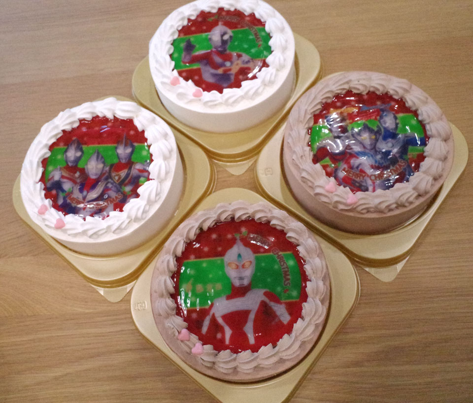 チキンより一回り大きい包をなんとか大泉学園までもっていって、ケーキはやはり鬼太郎スタッフが先日の円谷フェスで購入したというウルトラマンケーキ4種。