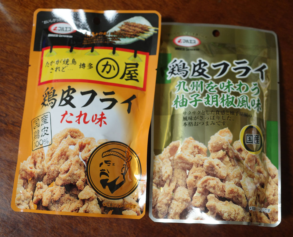 鶏皮がチップスのように軽くなってて、たれ味と九州を味わう柚子胡椒風味(長い)どちらもおいしい。が、問題はその軽さと美味しさで、一袋あっという間に食べてしまうので、おやつとしてはコスパがかなりよくない。酒のつまみにはピッタリかと思います。