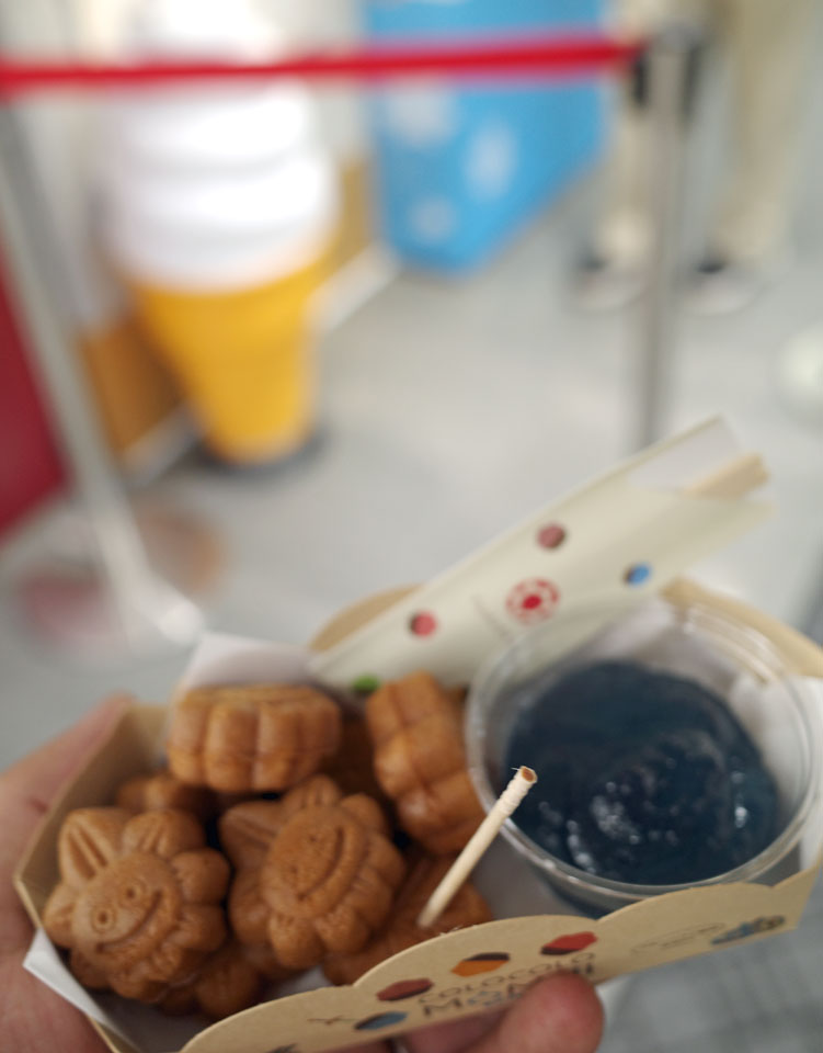 コロコロもみじというこぶりなもみじ饅頭、焼きたてのものがいまならスライムバージョンが合ってしかも現地でしか食べられないフレーバー付き。このときはブルーハワイ。何種類かに変わっていくらしいですよ。てっきりこれもお土産にできるものかと思ってきたらそうではなかったものの、美味しくいただきました。