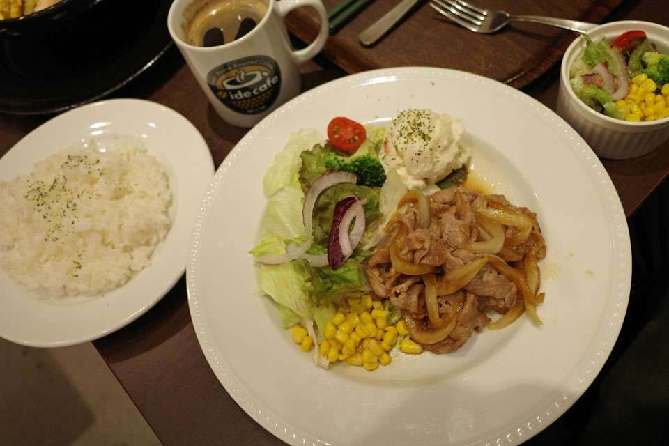 生姜焼きプレート頼んだんですよ。味付けがしっかりしてて、おいしい。が、都心部でのこの手の店より二割くらい多い感じ。お腹いっぱいなりました。