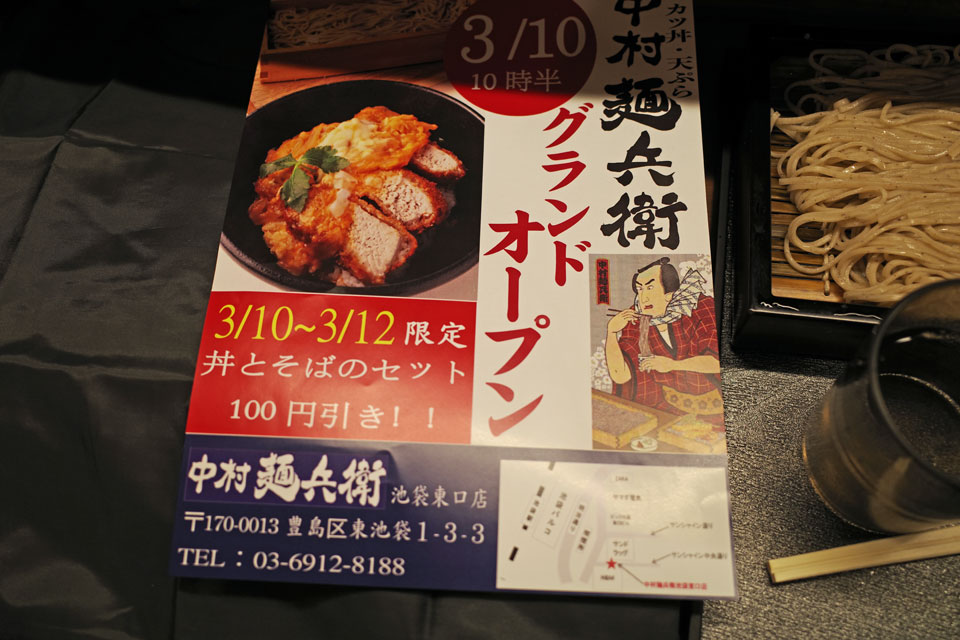 先週日曜東京アニメアワードから中野に行く前になにか腹に入れておこう、と前の日から気にしてた店がありまして。先日記事にしたタカセのコーヒーサロン裏通り側の斜向いあたりにちょうど金曜に開店したらしいそばと丼もの店、中村麺兵衛。