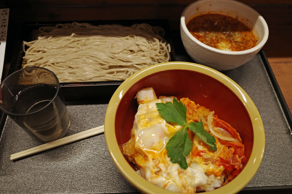 カツ丼と蕎麦のセット。その割に量が多すぎということもなく普通に食べられるくらいで、カツは厚めでサクサク、卵トロトロ。そばもそれ自体は細めで美味しい。ちょっと意外だったのが蕎麦のつけ汁で、普通の醤油味でなくラー油か何かの辛味がついたもの。美味しくないわけでもないけど、心の準備できてなかったので味わえなかったかも。他のタイプのつけ汁もあるといいなあ。カツ丼じゃなく天丼とかも試してみたいかも。